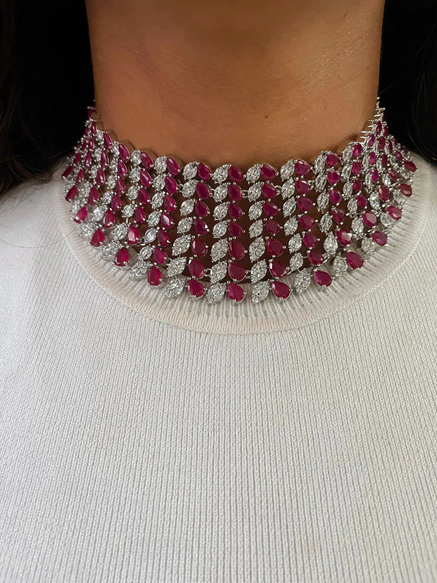这套套装是由令人惊叹的翡翠滴制成的,它是为其深绿色的色调和无可挑剔的清晰度而精心挑选的。祖母绿以无与伦比的光彩闪耀着沃罗维斯基钻石的令人眼花be乱的安排,并突出了它的自然风光和优雅。 Choker项链优雅地拥抱了领口,营造出醒目而精致的外观,散发着信心和风格。
