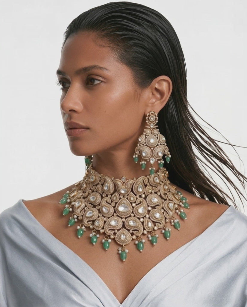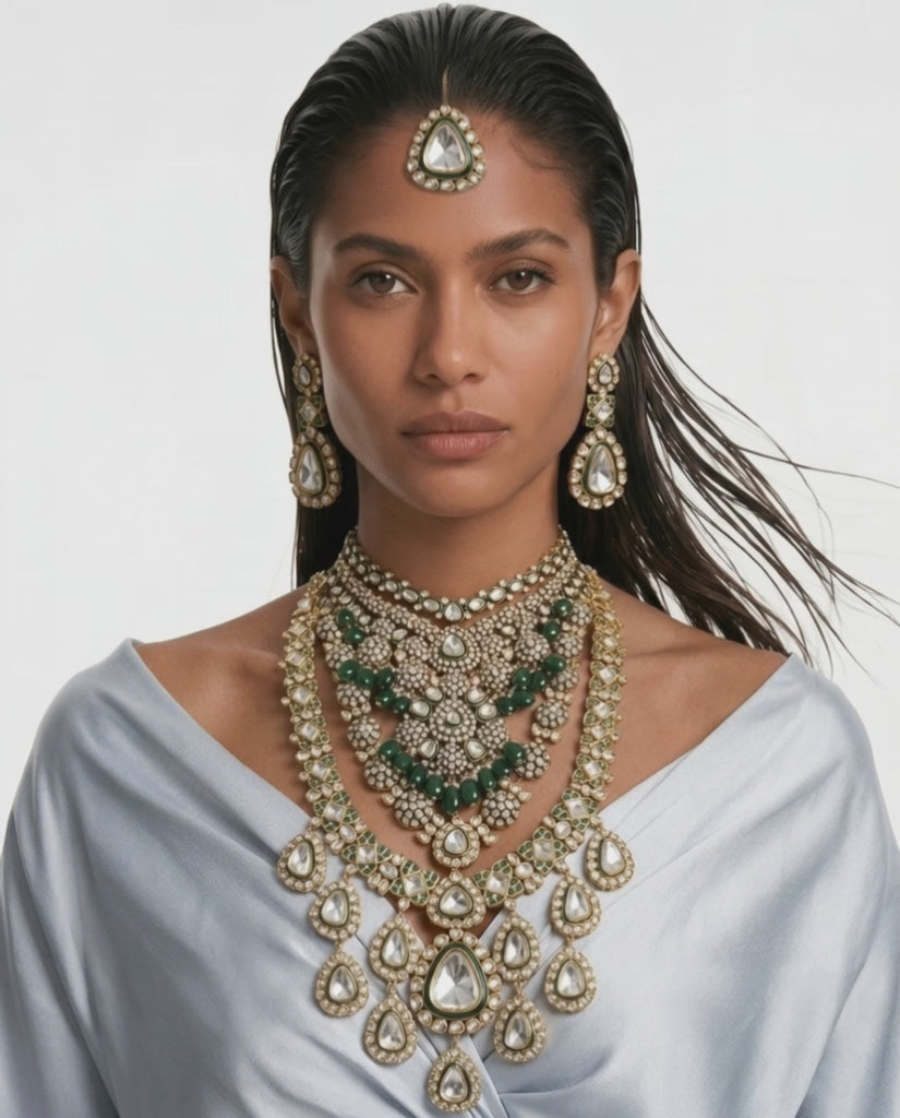 Maharani Alaya Emerald Moissanite Couture Royal Layered Necklace Set & Ausa 2 Layer Polki Geometric Kundan Necklace Set (2 Necklace, 2 Earrings & Mang Tika)