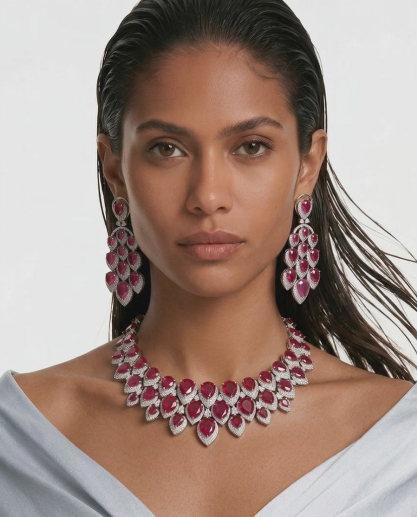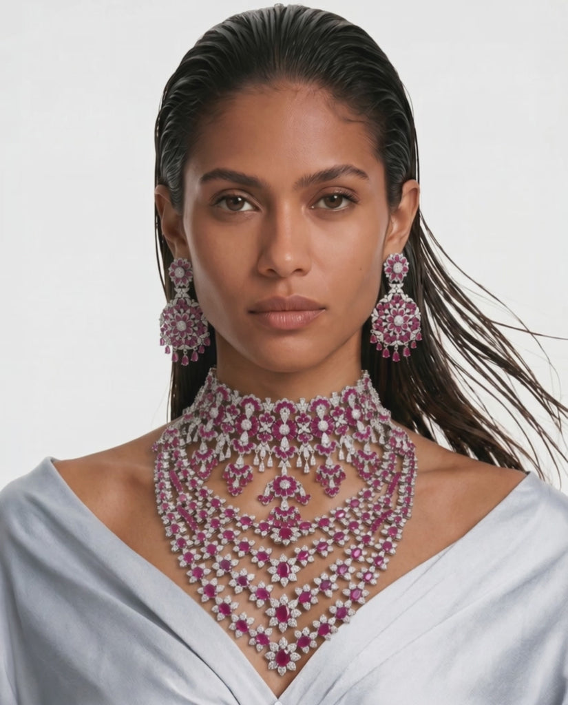 ✨ Maharani Ruby 3 Layered Floral Necklace Set & Gahri Ruby Diamond Floret Drops Necklace Set (2 Necklaces, 2 Earrings & Maang Tikka) Bold, regal, and exquisitely crafted, the Maharani...
