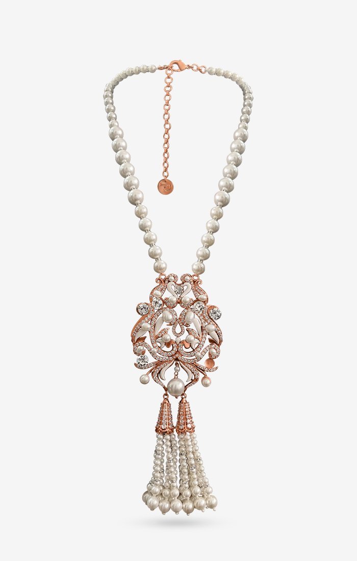 أضيفي لمسة من السحر الأنثوي مع عقد من اللؤلؤ المزين بالكريستال الأنيق إلى إطلالتك من خلال قلادة كوراليا المذهلة.يمكن تنسيق قلادته مع فستان سهرة تمامًا كما هو الحال مع الفرق الهندية.