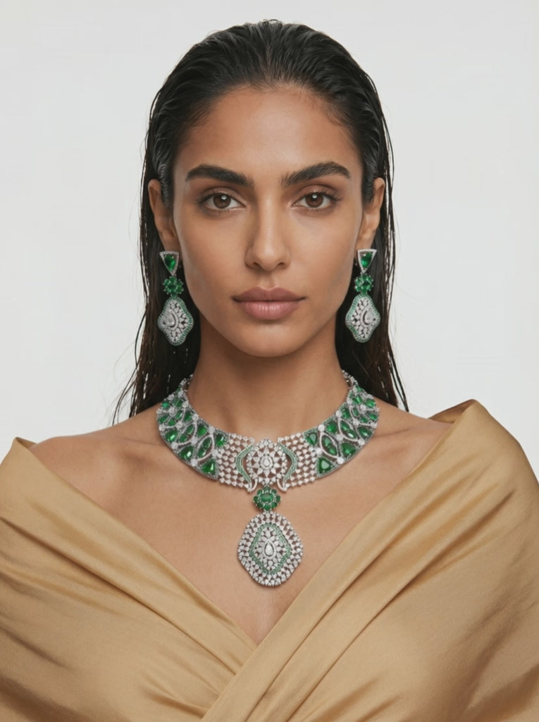 Momike Emerald and Diamond Drops Statement Necklace Set (Necklace & Earrings)