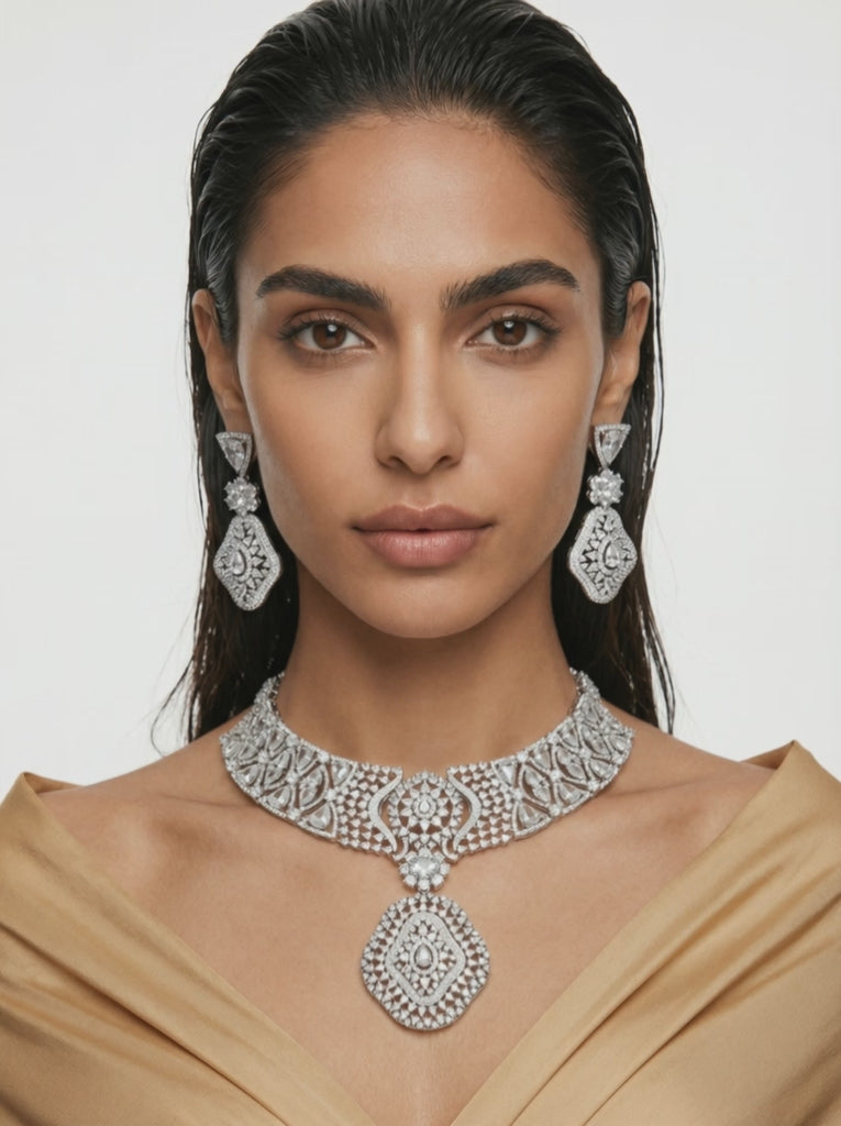 Momike Diamond Drops Statement Necklace Set (Necklace & Earrings)