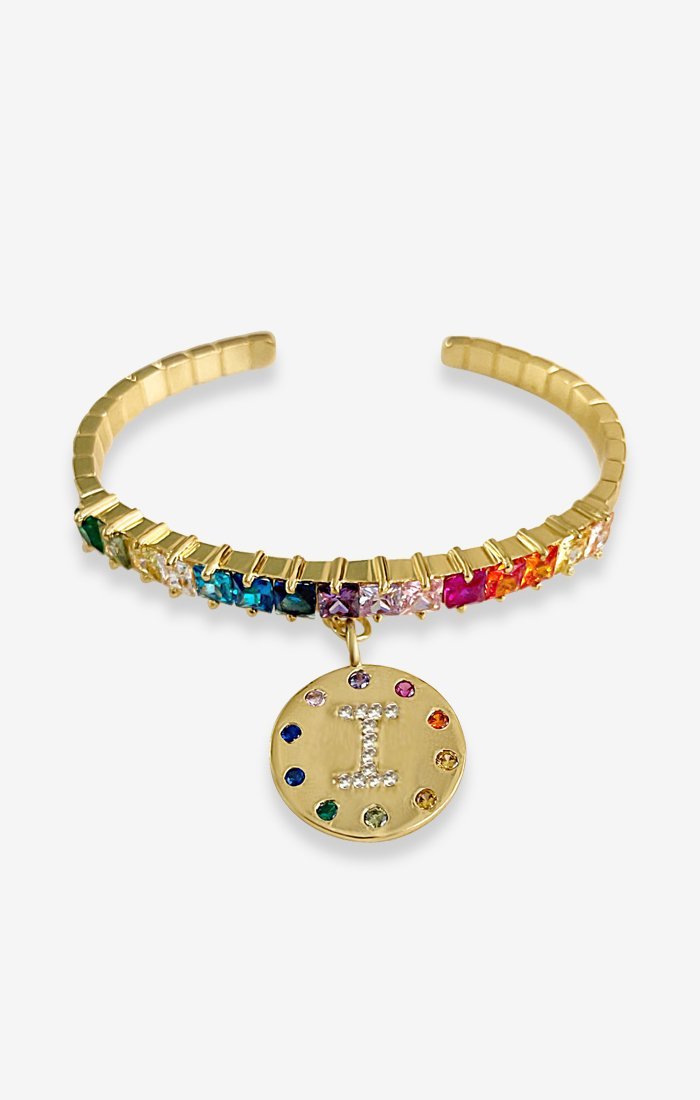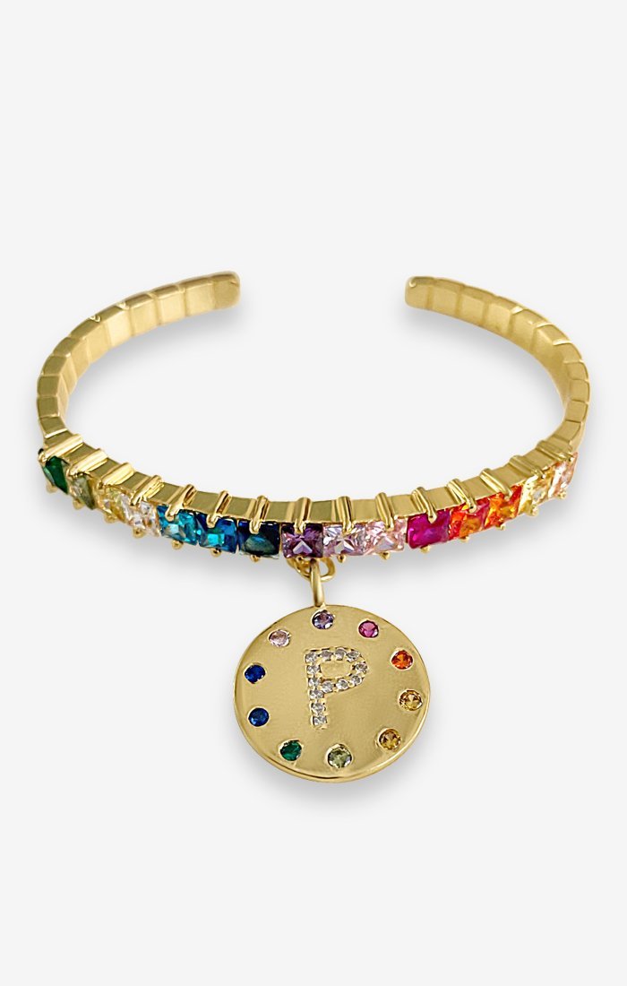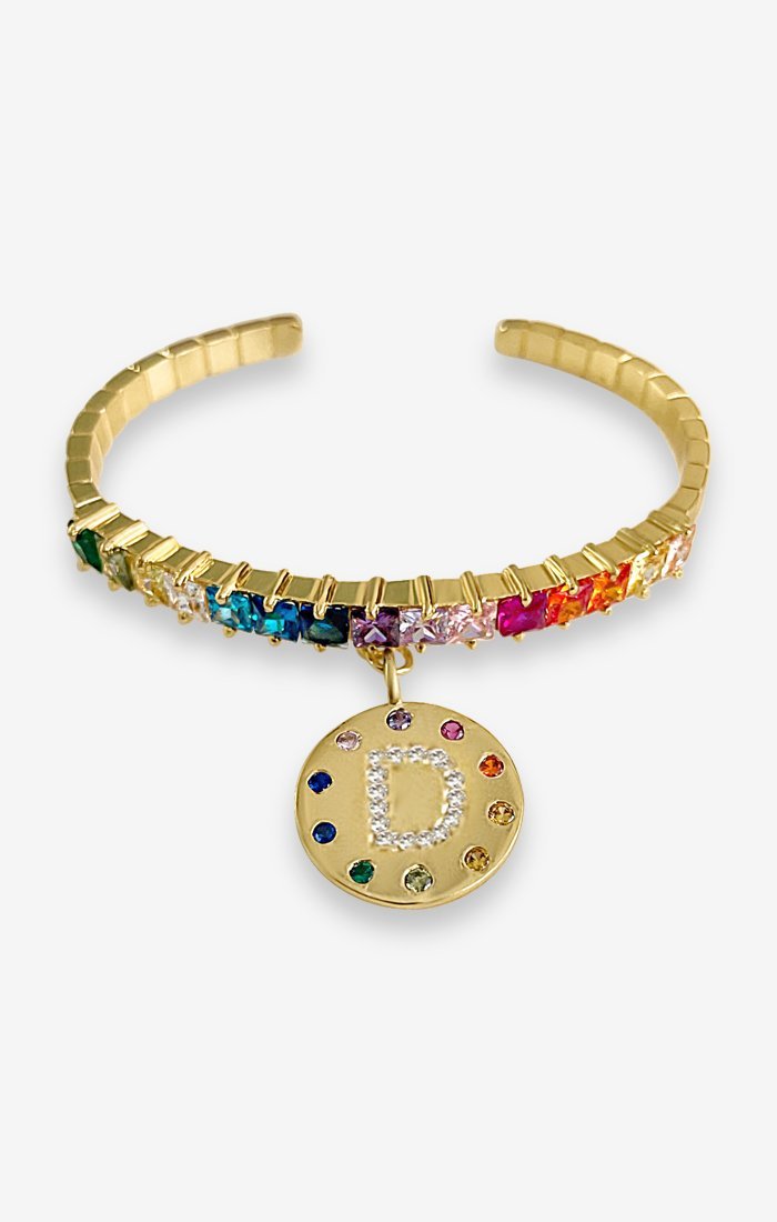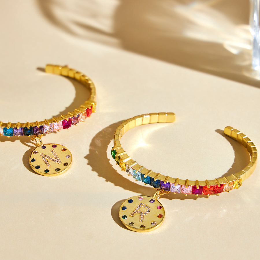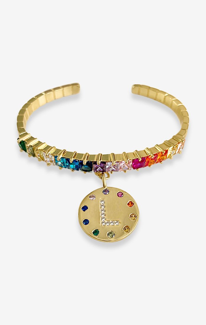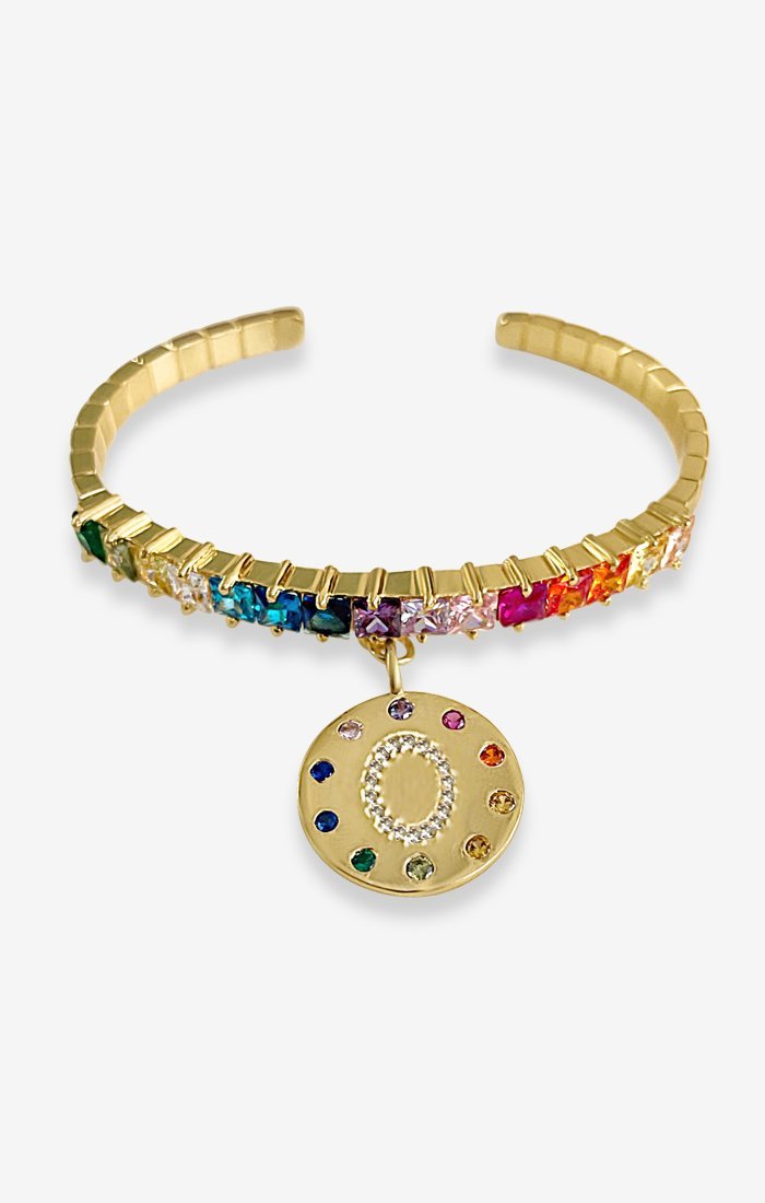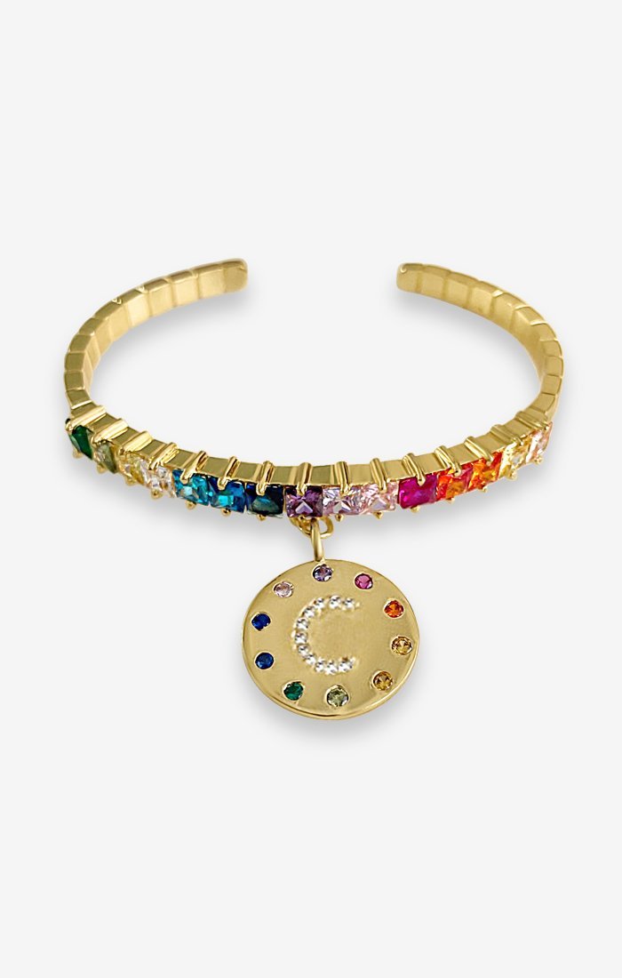 Brighten your everyday look with the dazzling Orian Iniziale Rainbow Cuff from our popular Charms Collection. This handcrafted cuff is beautifully finished in 24K gold plating and adorned with a vibrant row of rainbow sparkling crystals, making it the perfect statement piece to elevate your daily stacks. What makes it truly special? The personalised initial charm attached, adding a unique touch just for you.