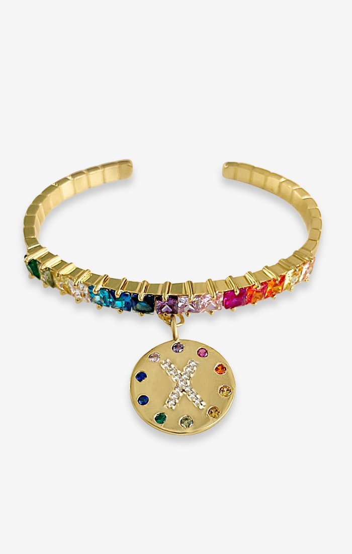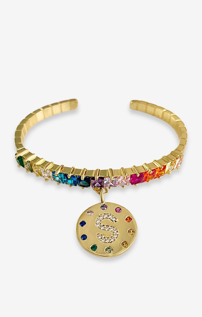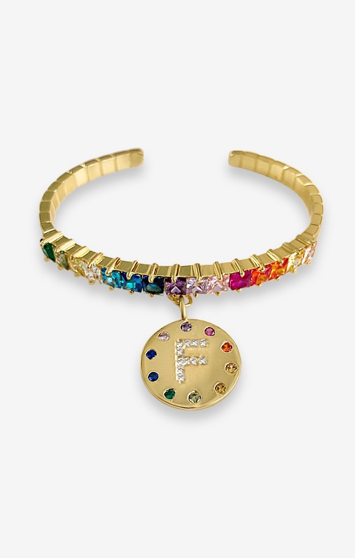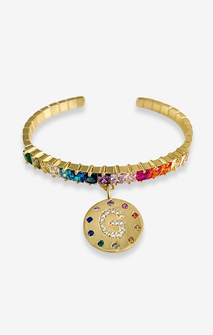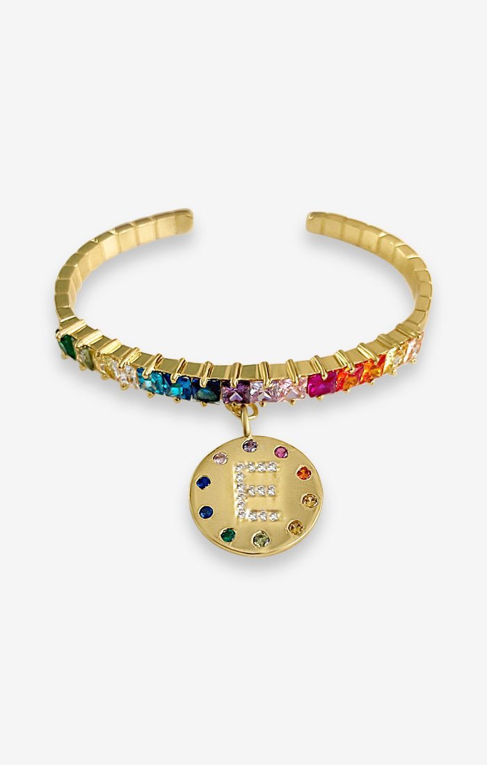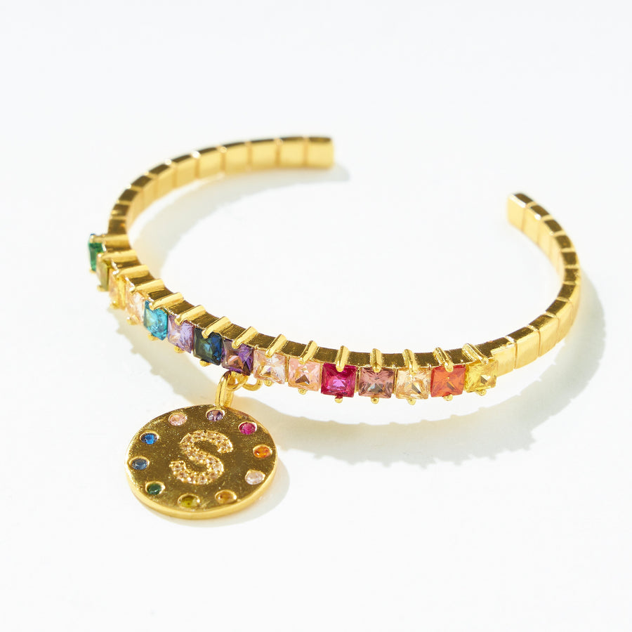 Brighten your everyday look with the dazzling Orian Iniziale Rainbow Cuff from our popular Charms Collection. This handcrafted cuff is beautifully finished in 24K gold plating and adorned with a vibrant row of rainbow sparkling crystals, making it the perfect statement piece to elevate your daily stacks. What makes it truly special? The personalised initial charm attached, adding a unique touch just for you.