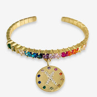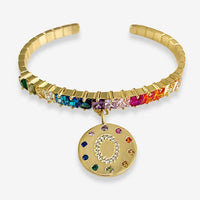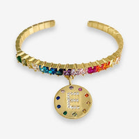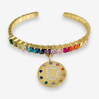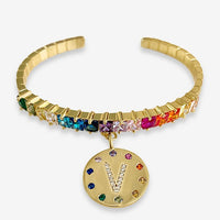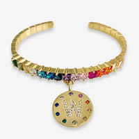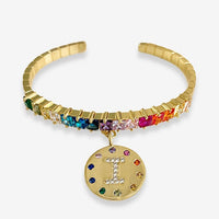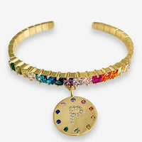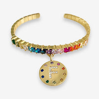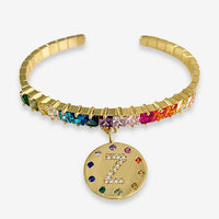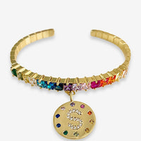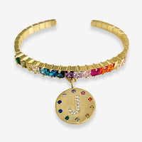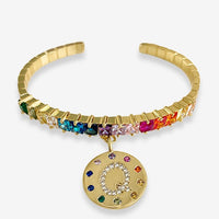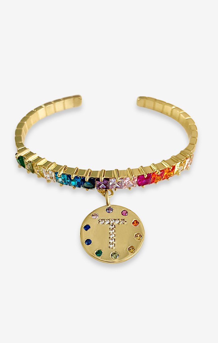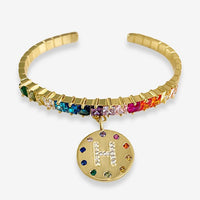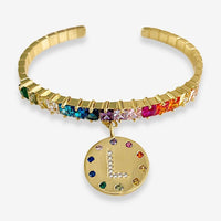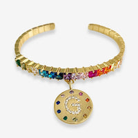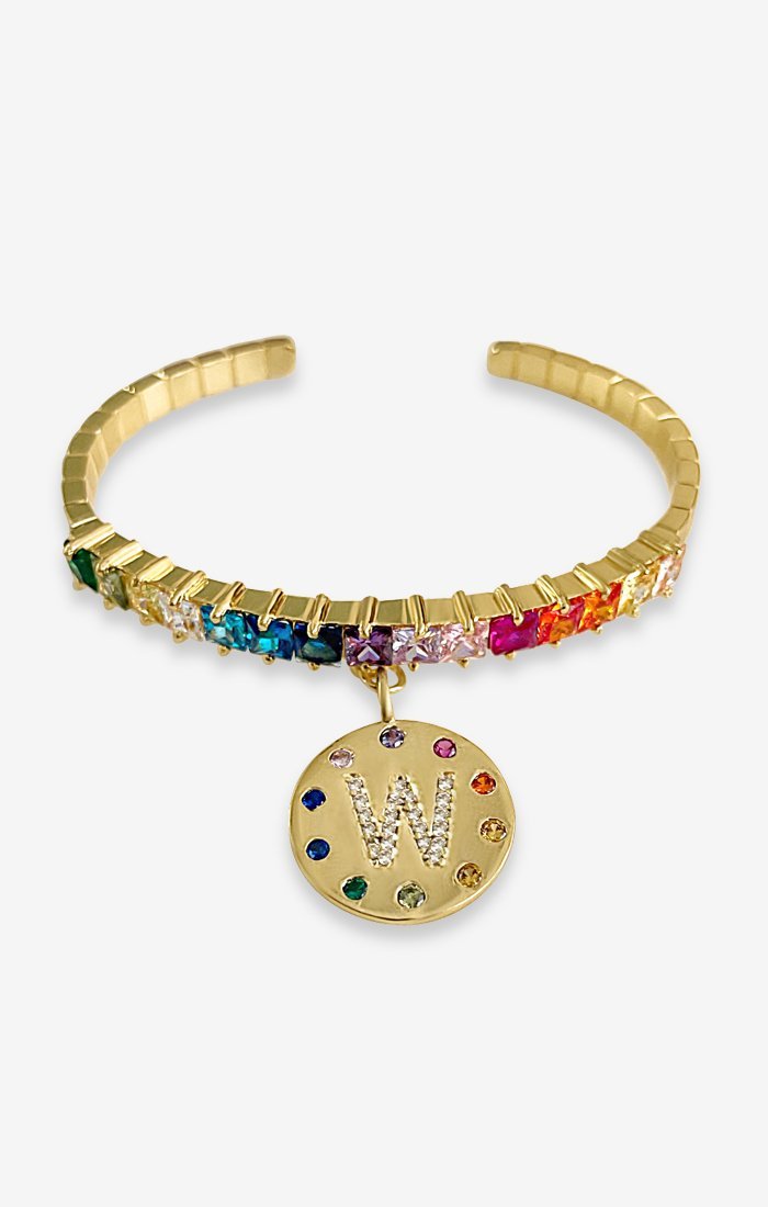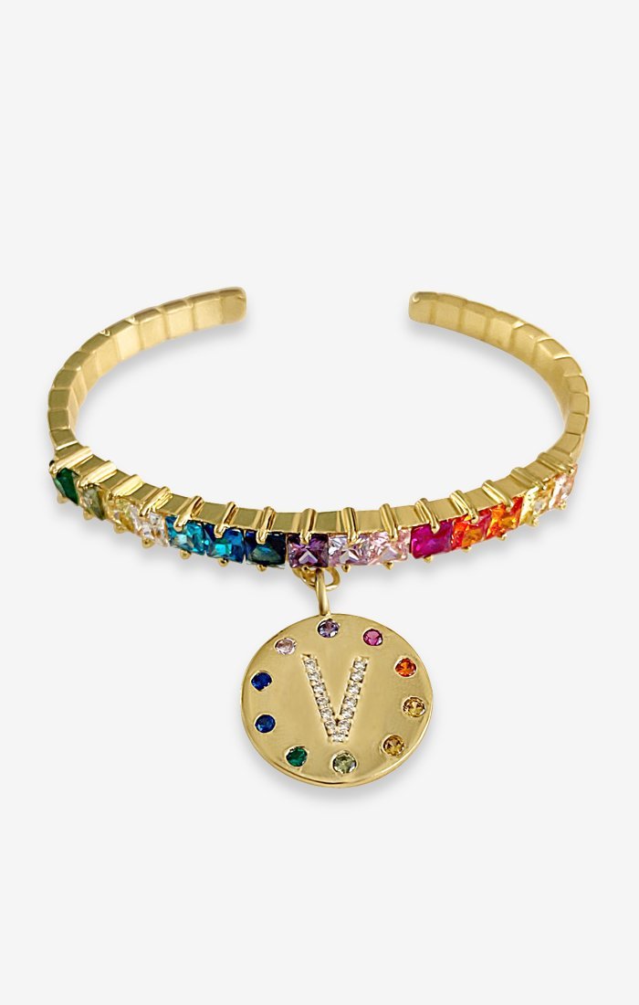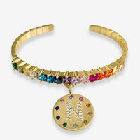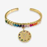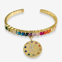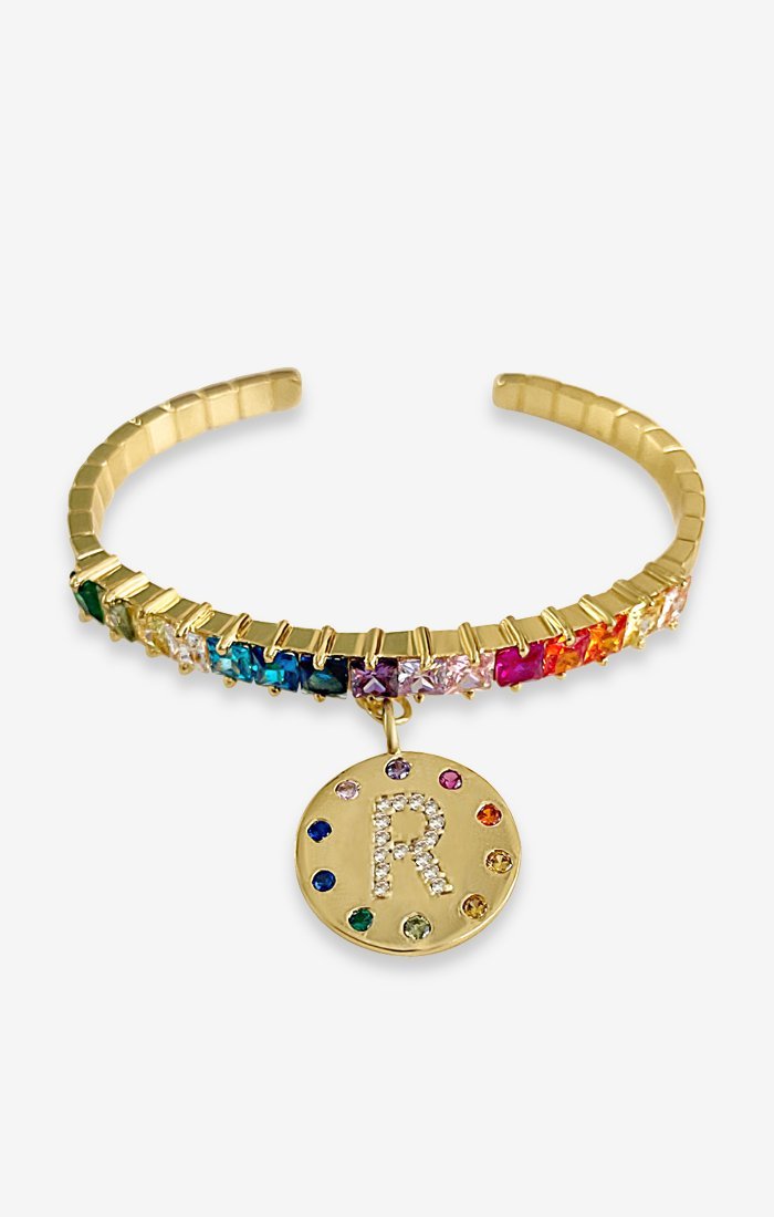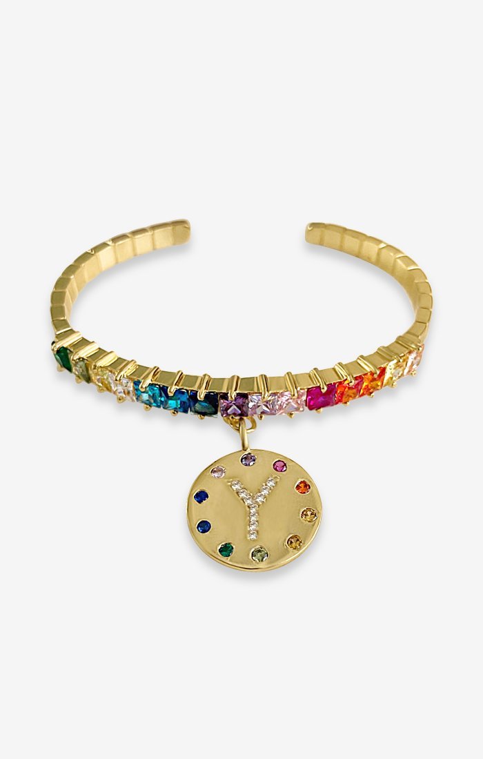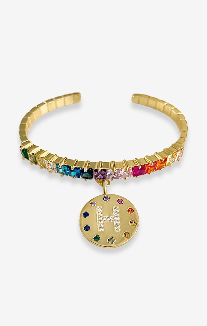 Brighten your everyday look with the dazzling Orian Iniziale Rainbow Cuff from our popular Charms Collection. This handcrafted cuff is beautifully finished in 24K gold plating and adorned with a vibrant row of rainbow sparkling crystals, making it the perfect statement piece to elevate your daily stacks. What makes it truly special? The personalised initial charm attached, adding a unique touch just for you.