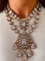Dual Pendant with Drop Detailing Polki Diamond Kundan Victorian Finish Necklace Set (Necklace & Earrings)