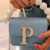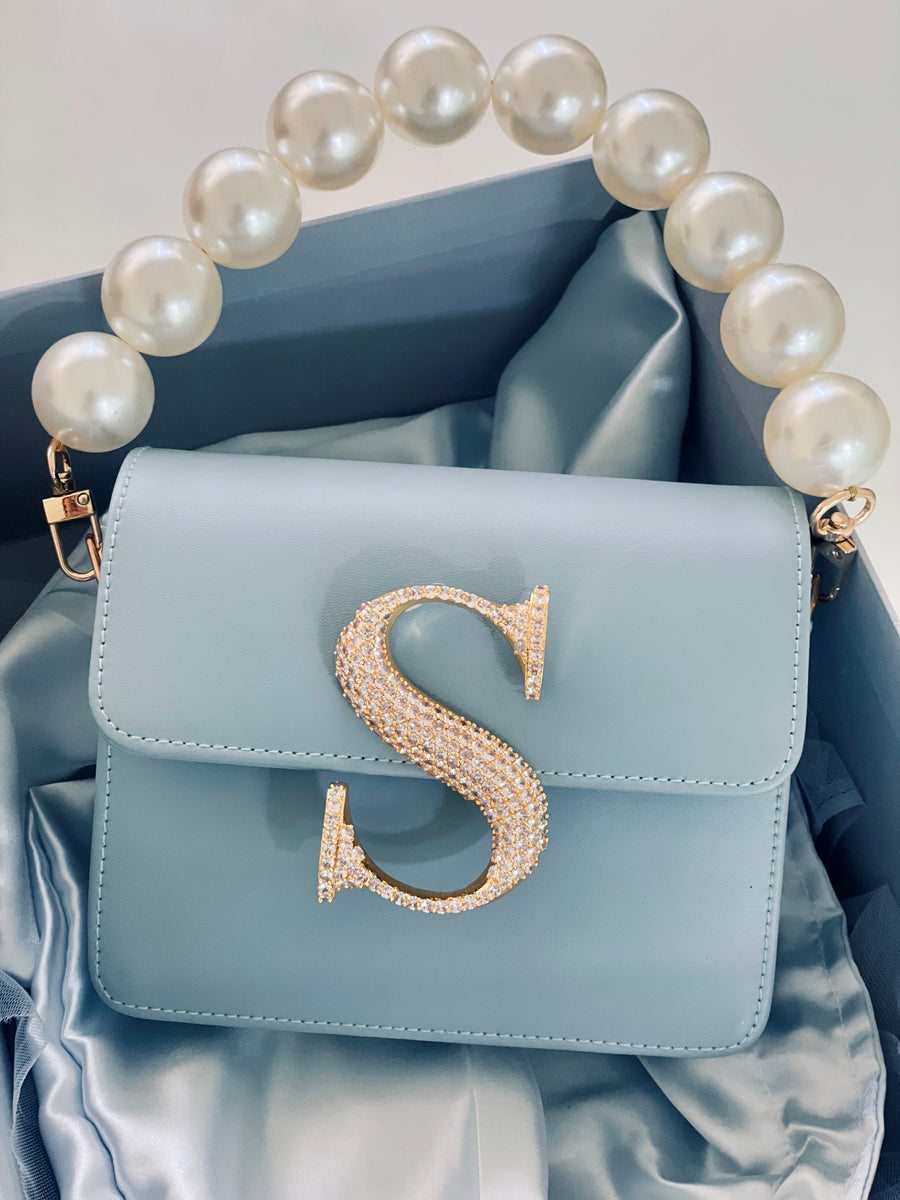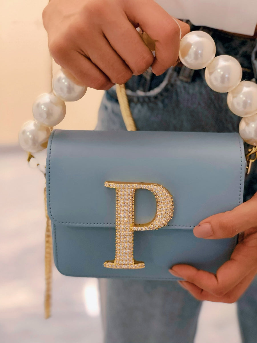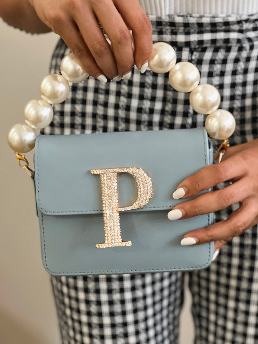 Le crossbody alphabeto bleu poudre est que chaque rêve de filles se réalise! Parfaitement dimensionné pour s'adapter à tous vos éléments essentiels, avec des sangles de perle et de chaîne détachables, ce sac sur mesure est tout ce que vous attendiez.