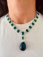 Emerald Cushion gesneden met zirkoondetails en grote smaragdstenen ketting (ketting en oorbellen)