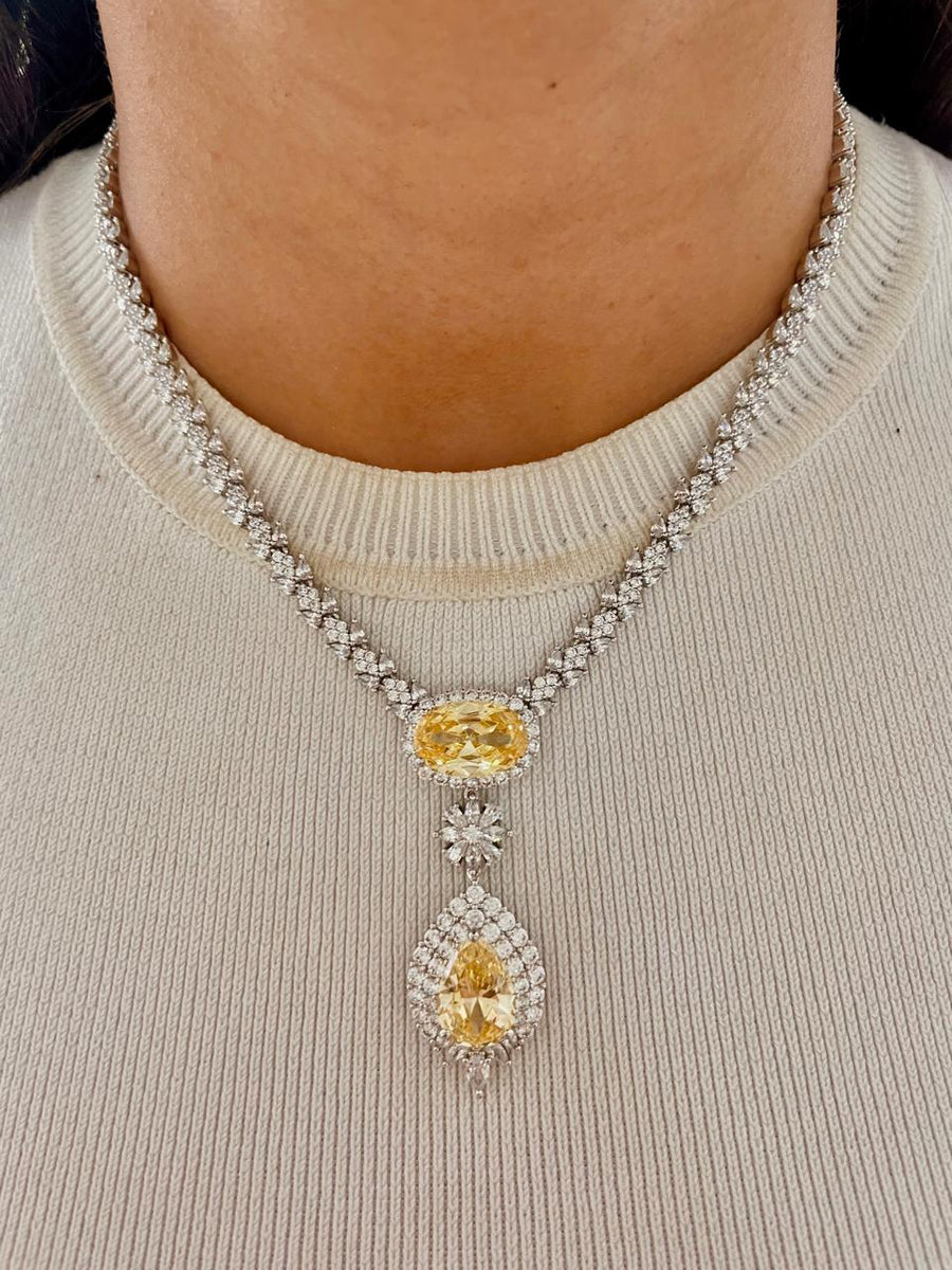 Ships quickly to New York, London, Dubai, Riyadh, Kuwait City, and Doha. Illuminate your look with the dazzling Comet Diamond Citrine Tear Drop Necklace Set—where celestial charm meets radiant sparkle.