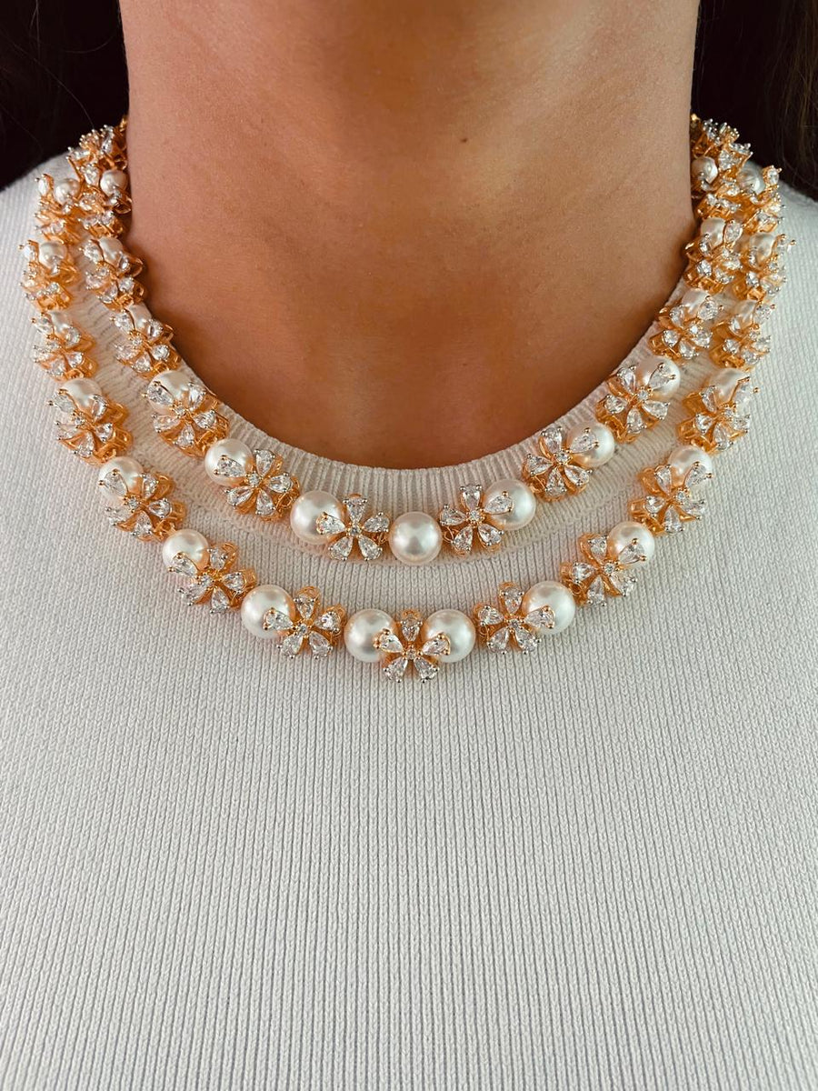 Dual Pearl Floret Golden Finish Necklace Set (Necklace & Earrings)