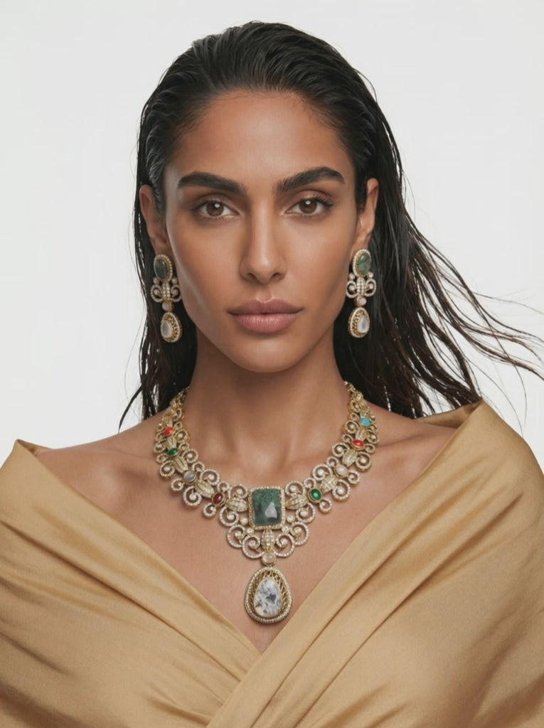 This stunning piece showcases a harmonious blend of multi-colour stone accents, creating a lively and eye-catching palette that complements a wide range of outfits. Intricately crafted with moissanite stones and traditional Polki Kundan detailing, the design reflects timeless heritage artistry with a modern, luxurious finish.