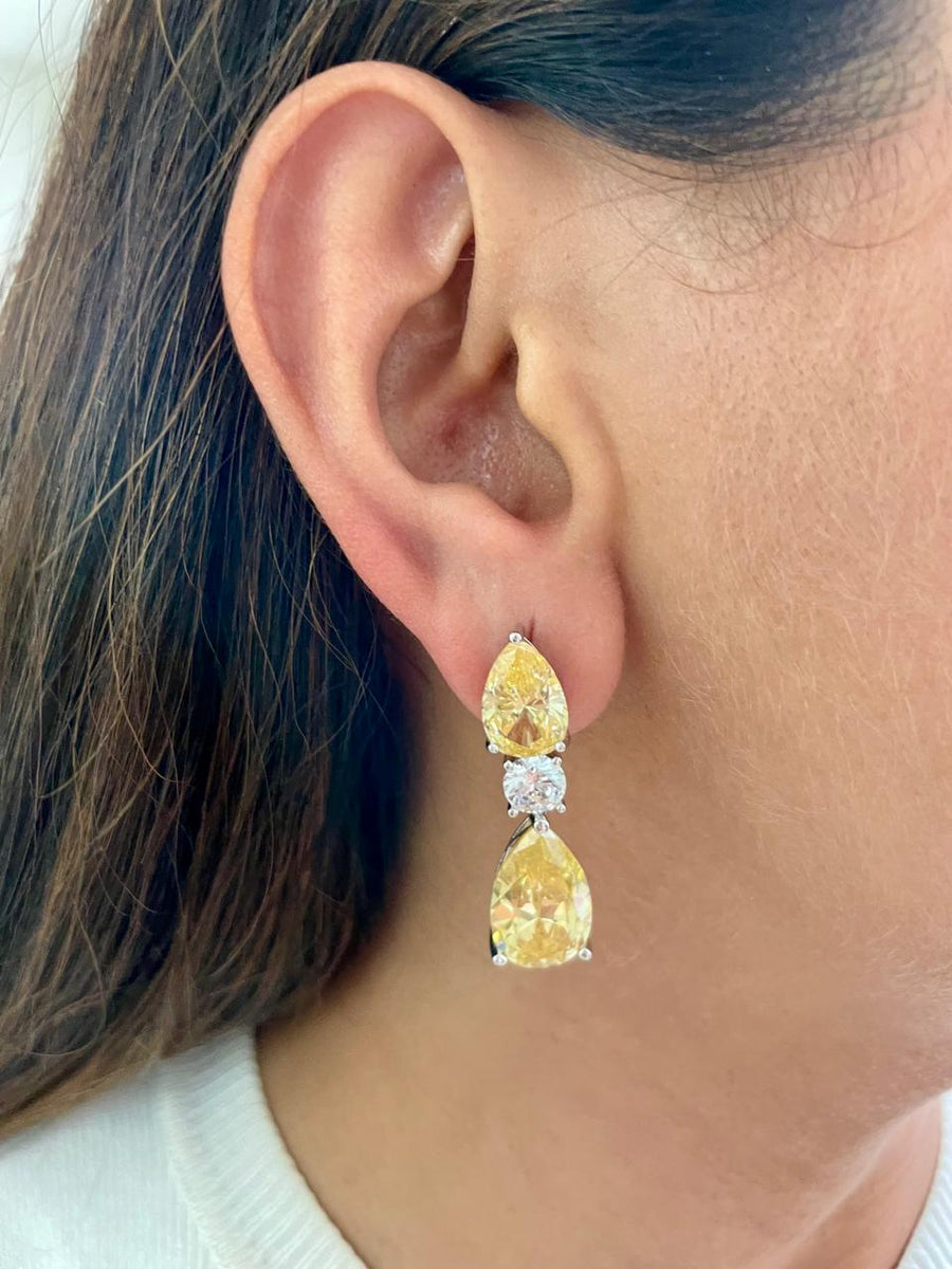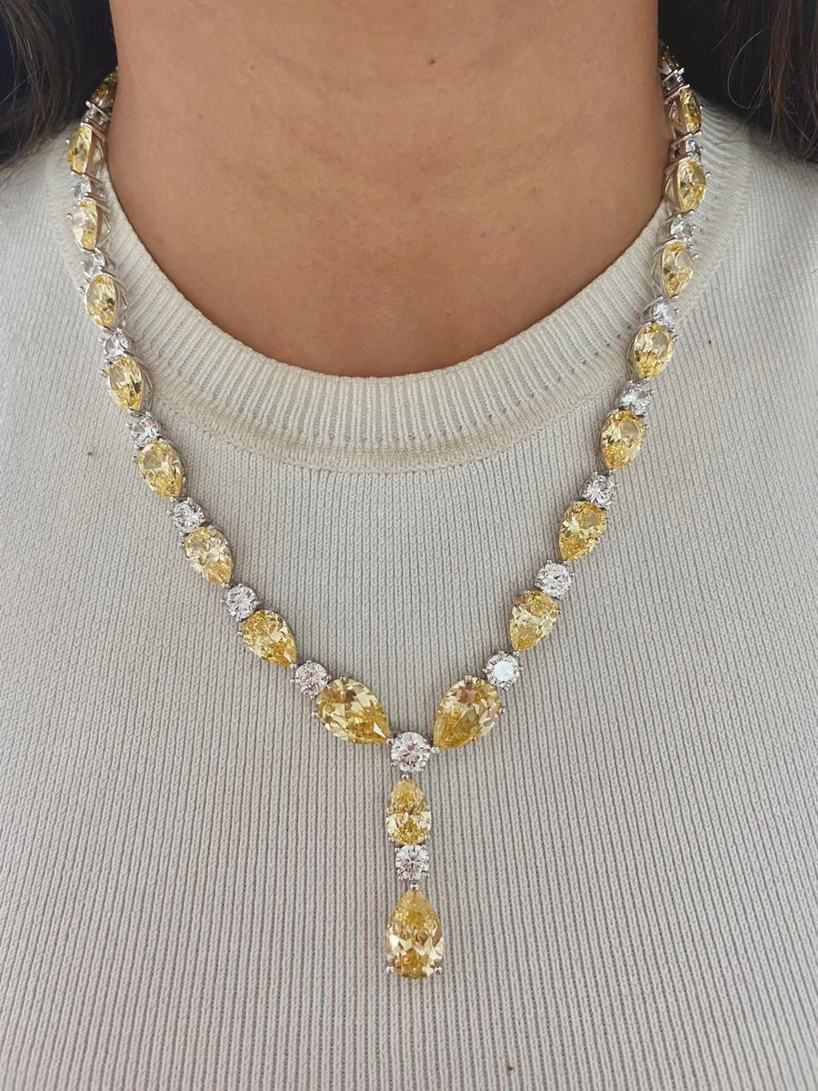 Add a radiant glow to your jewelry collection with the Lenti Tear Drop Citrine Diamond Necklace Set, featuring vibrant citrine-colored stones paired with sparkling zircon crystals in a graceful tear-drop design. This elegant necklace and matching earrings set is perfect for weddings, parties, or gifting luxury jewelry.