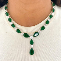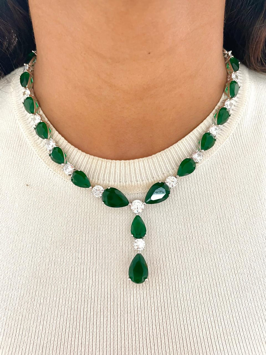 Add a touch of royal elegance with the Lenti Tear Drop Emerald Diamond Necklace Set, featuring rich emerald-green stones paired with sparkling zircon crystals in a sophisticated tear-drop design. This stunning necklace and matching earrings set is perfect for weddings, formal events, or luxurious gifting.