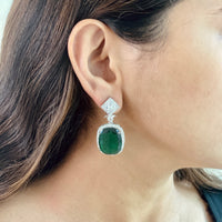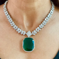 The pendant and earrings are expertly crafted to complement each other effortlessly. The necklace features a delicate chain that elegantly suspends the pendant, allowing it to rest gracefully against your neckline. The earrings mirror the pendant's design with their own exquisite emeralds encircled by Swarovski diamonds, gently dangling from your earlobes with refined grace.
