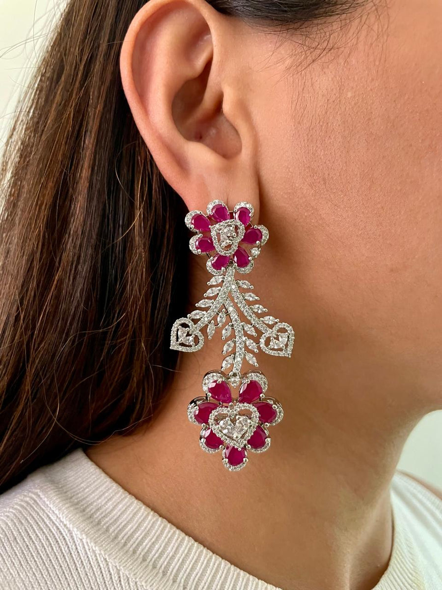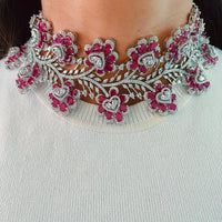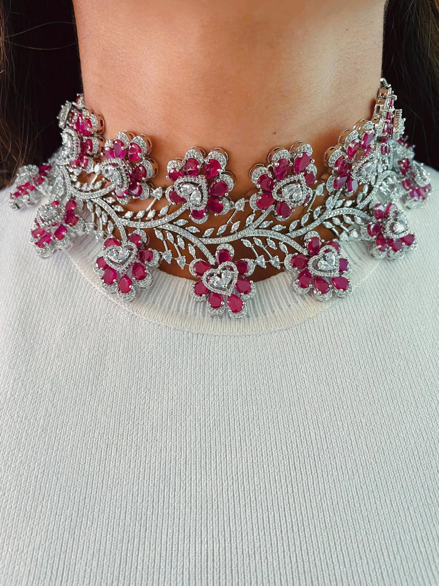 The Ruby Veil Heart Diamond Tear Drop Necklace Set (Necklace, Earrings, Ring & Mang Tika) is an absolute Statement maker to take your outfit a 10 on 10 look.  This Necklace is handcrafted to make to shine every time you adorn it. Perfect for Any Occasion.