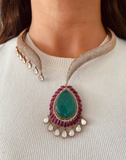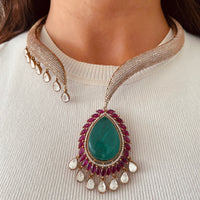 Turn every head in the room with the Emerald Doublet Open Choker Set, intricately designed with brilliant zircon accents and sparkling moissanite drops. This bold open choker design merges timeless grace with modern-day glamour, creating the perfect fusion for bridal and festive wear.